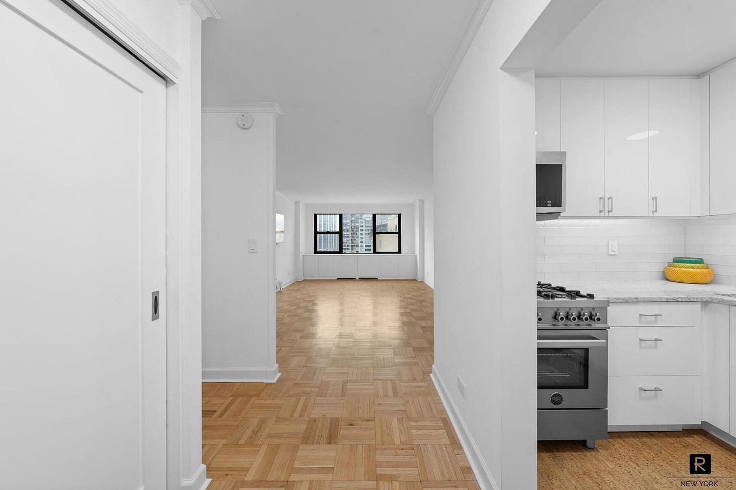 Approximately 720 sqft, apartment 12-L's sizable foyer leads to a large living room that can easily accommodate dining as well as a desk/work area. To the right of the foyer is an elegant, newly renovated and artfully designed kitchen that doesnt waste an inch of space, featuring: a Miele dishwasher, Bertazzoni stove, an extra tall Liebherr fridge, speckled pearl granite countertops, cork satin wood flooring, and custom-built soft-close cabinetry. To the left of the foyer, a hall leads to a renovated bathroom with a timeless design thoughtfully fashioned with high-end materials and fixtures, including a Toto toilet. And arriving at the hall's end, you'll find a sunny over-sized bedroom that can easily accommodate a King-sized bed as well as additional furnishings. In total, the apartment features four large closets: a walk-in closet in the foyer, a large storage/linen closet at the end of the hall, and two custom-designed wall-to-wall closets in the bedroom. (Three of the four closets have sliding doors with satin nickel pulls, maximizing functionality and space.) Other noteworthy features include: unobstructed light and views; base and crown moldings; clever custom enclosures for the bedroom and living room HVAC units, with additional storage running along the length of the wall beneath each room's east-facing windows.