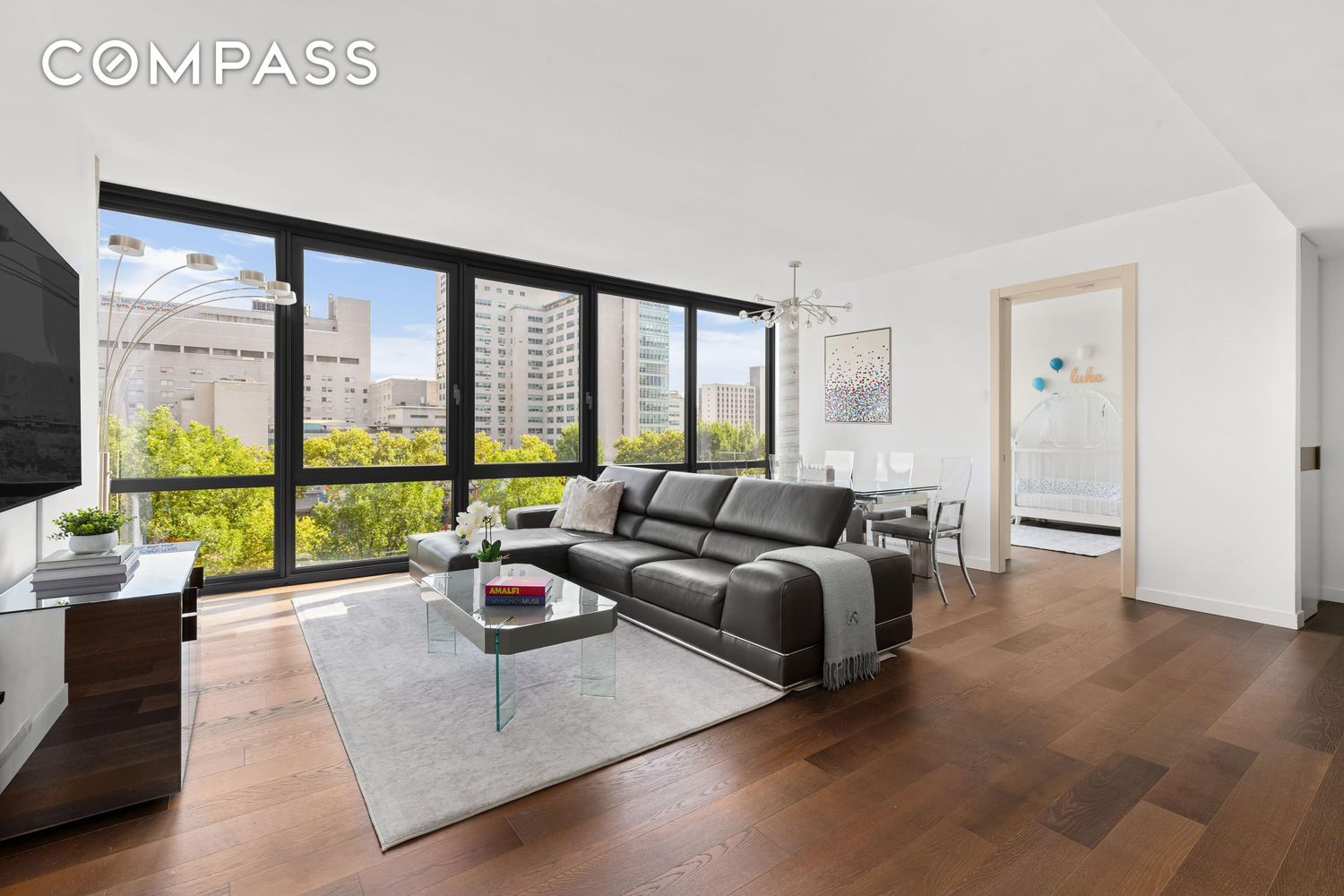 Upon entering, you are greeted with a sprawling great room featuring a wall of floor-to-ceiling windows framing picturesque tree top views and bright open sky. Beautiful smoked white oak flooring enriches the living and dining area.