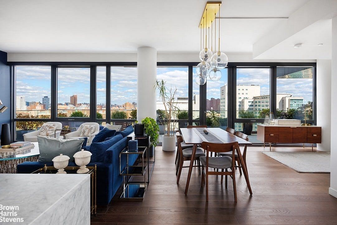 The living/dining room and very generous open kitchen with its 12-foot Carrera marble floating kitchen island are the stuff of dreams. Such a room is unique not just for its scale, but also for its ceiling height, glass curtain wall, and connected 500sf north-facing landscaped terrace. Your eyes are drawn to the unobstructed views, including those of Central Park and the East River, making it supremely practical and a visual joy, directly connecting you with the city at all times of the day and year.