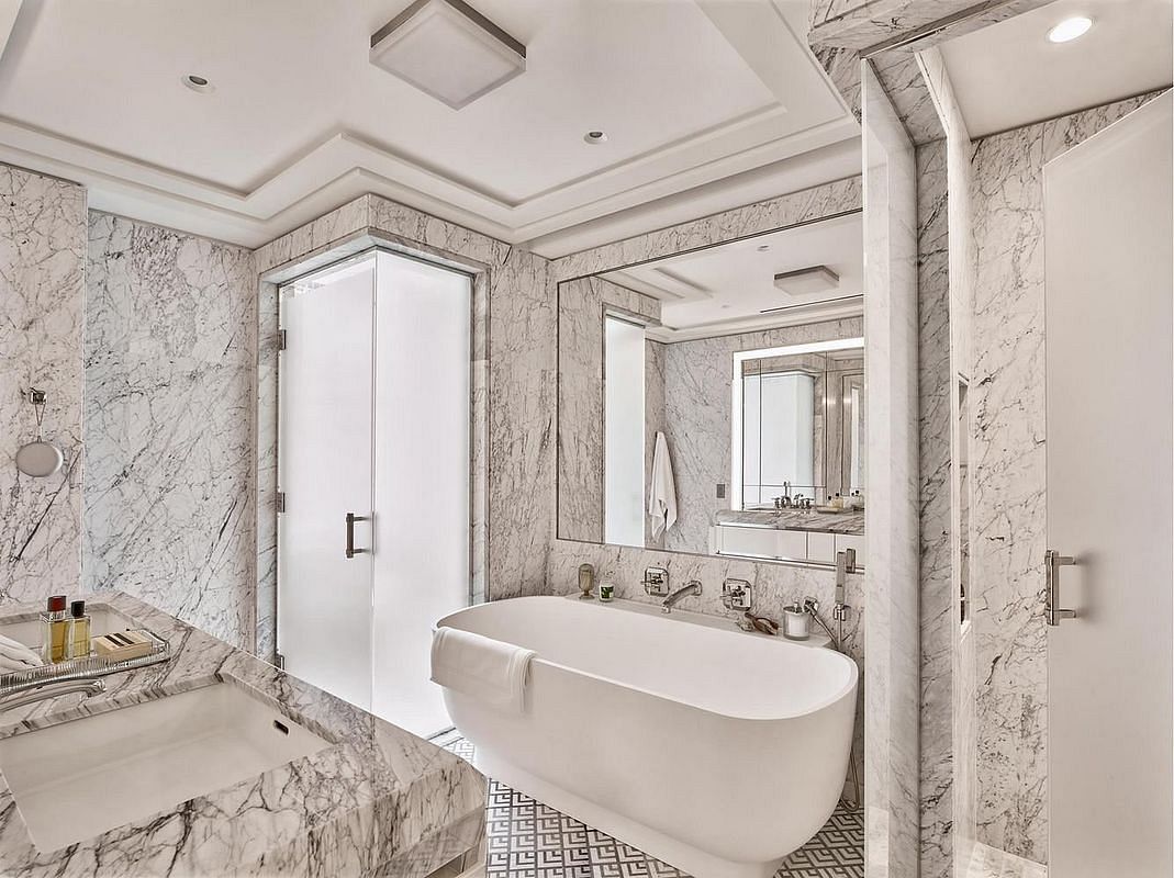 The primary bedroom has a large walk-in closet. The windowed five-fixtured bathroom features floor-to-ceiling honed white Bianca Carrara marble slab walls and radiant heated custom designed mosaic marble tile floor. A custom double vanity with polished Luna Gray marble countertop, elegant stainless-steel legs, and integrated lighting provides exceptional storage complementing the cabinet with integrated lighting, mirror and concealed electric outlet. The freestanding custom designed deep soaking tub offers a thoughtful shelf and sits below a large custom wall mirror featuring fixtures and fittings that are custom forged in polished nickel, exclusively for Waldorf Astoria Residences.