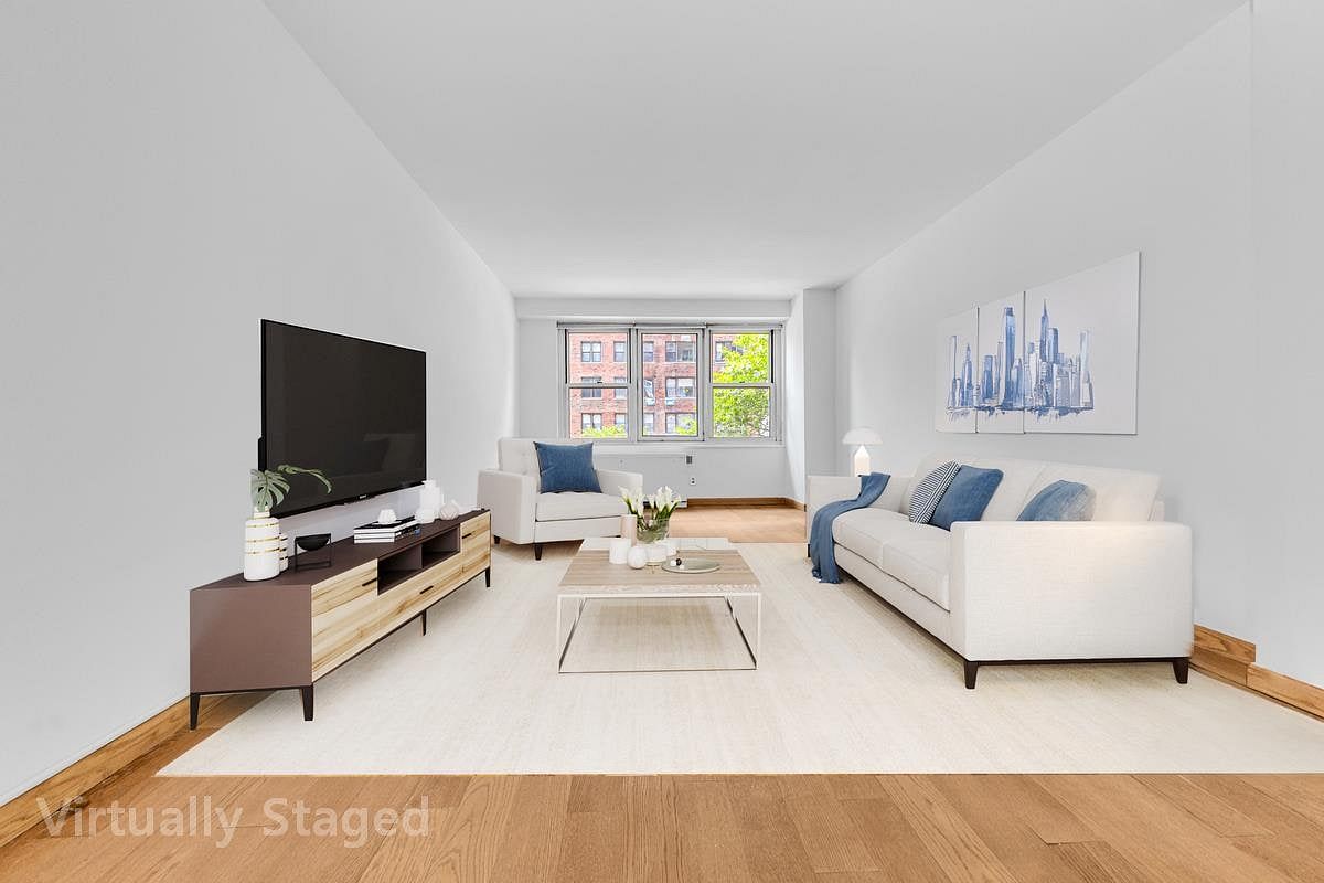 This bright and airy oversized one bedroom (19x10'1) includes two separate, large closets, and noise abatement, west - facing windows. This gorgeous primary bedroom features space for a king sized bed as well as night stands/dresser/reading nook. It could even fit a home office or exercise area. West-facing wall of windows span the entire width of the expansive living room, providing gorgeous natural light and lovely green trees in your view.