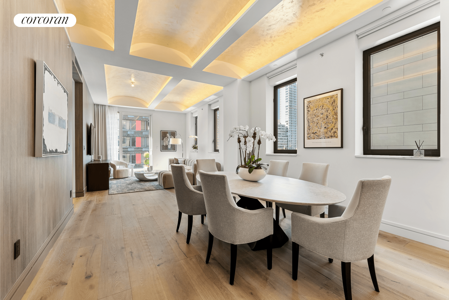 Enter the expansive 31-foot living and dining space boasting 11-foot barrel vaulted ceilings and 10-inch wide-plank engineered oak floors. Extending the living space outdoors, is a balcony through a floor-to-ceiling sliding glass door, behind an all-glass railing, welcoming in an abundance of natural light.