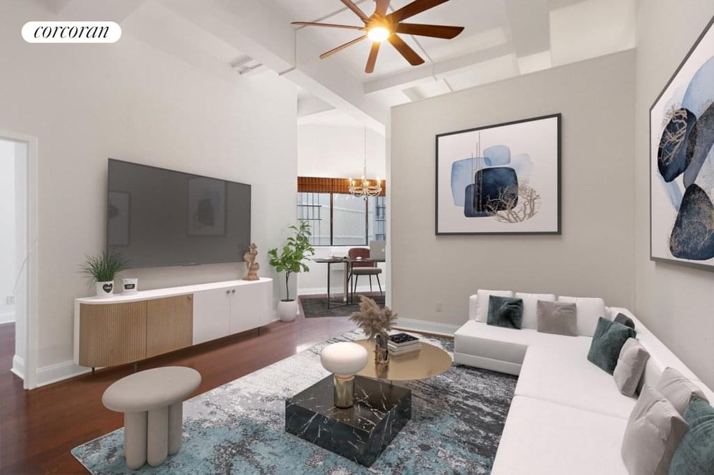 310 East 46th St #14A is a spacious home in excellent condition, a large space with towering ceilings! This is a 14th floor, converted two bedroom apartment with 12.5 ft beamed ceilings and over-sized windows. Off of the entry foyer there is a separate updated kitchen with granite counters and stainless steel appliances. Hardwood floors throughout & a huge walk-in lofted closet that doubles as a built-in home office. The oversized living room was converted into a flex-two bedroom with enough space for comfortable living and dining areas.