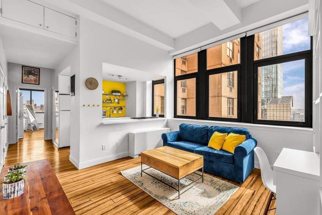 Sunny days ahead! Perched high on the 22nd floor with open Northern city views and captivating East River views inducing the iconic Pepsi-Cola Sign. This bright residence enjoys walls of windows, beautiful dark hardwood floors and soaring ceilings throughout. Enjoy cooking or entertaining in the fully equipped windowed chefs kitchen with ample counter space featuring Caesarstone countertops, custom cabinetry, dishwasher and microwave. The living room features a built-in shelving unit and desk. The large one bedroom has a new cooling and heating unit, custom full wall cubbie system and large closet. There is extra storage above the hallway. This special gem has it all also available fully furnished.
