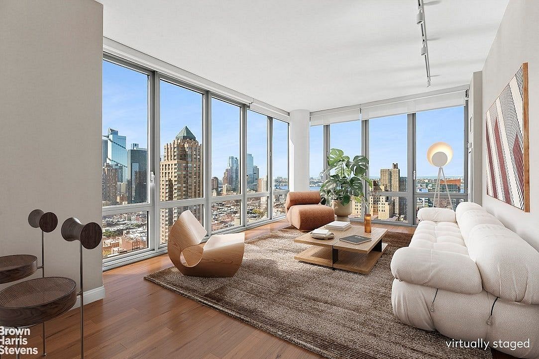 Perched high above Midtown, Residence 28B at The Link Condominium is a sun-filled, corner two-bedroom, two-and-a-half-bath spanning over 1,300 SF. Walls of glass frame cinematic vistas: majestic Hudson River views to the west, sweeping open cityscapes to the south and east, and vibrant sunsets that fill every room with light.