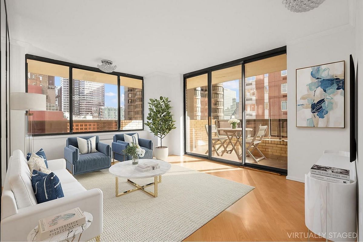 The corner living room features oversized windows, bathing the space in sunlight and offering direct access to a spacious wraparound terrace-your own private outdoor oasis, perfect for relaxing or entertaining. The bedroom offers large windows that bring in even more light and show off the apartment's skyline views.