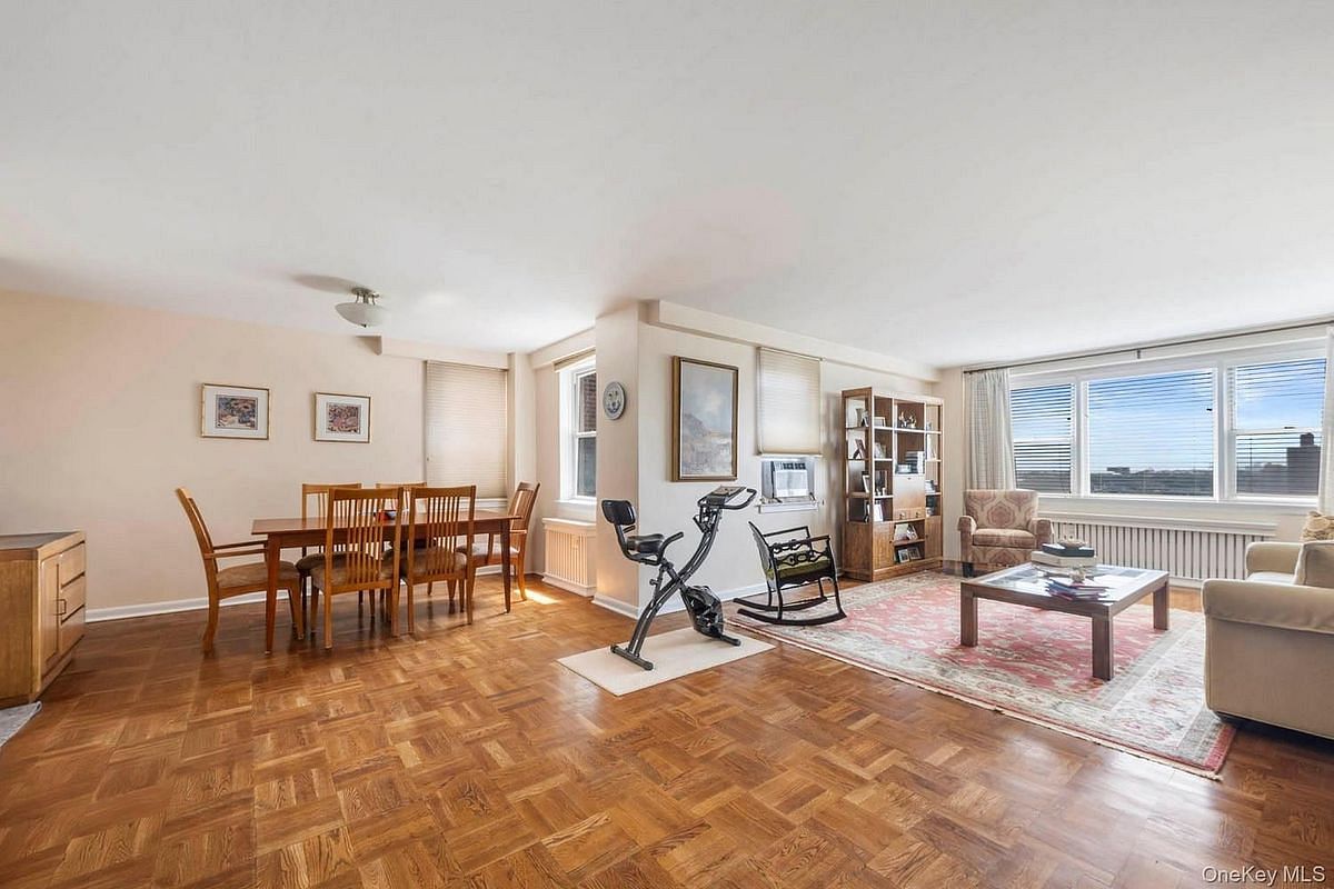 First time available since the early 80s! Move right into this oversized two-bedroom (convertible 3 bedroom), two-bathroom corner residence located in the highly sought-after Edmond Lee, a full-service cooperative ideally situated near shops, transportation, and all that Riverdale has to offer.This thoughtfully designed home features a spacious and inviting layout perfect for both entertaining and everyday living. The large windowed kitchen is outfitted with stainless steel appliances, granite countertops and dishwasher was renovated about ten years ago. Fire proof construction with concrete between floors - cuts down on noise transference. Original polished hardwood floors throughout.The private bedroom wing offers two generously sized bedrooms, all with ample closet space. The primary suite includes a large en-suite bathroom, multiple closets flanking the bedroom hall. The over sized second bedroom has two closets and windows facing west. There is also access to the private screened in terrace with Southern views of the city and to the west you can see the Palisades in New Jersey.