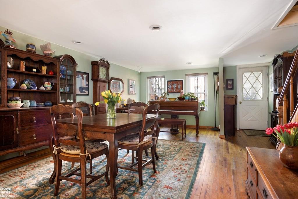 Some lovely original details remain in the home, including wood carved column pillars on the parlor floor, a combination of wide pine plank and parquet floors throughout much of the house, a few tin ceilings including one in the kitchen, and picture moldings on the walls on the upper floors.
