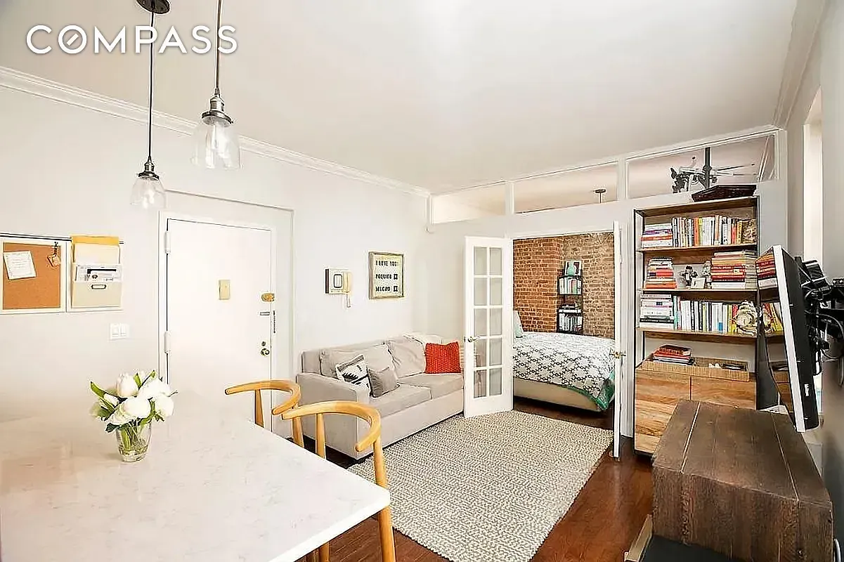 Apartment 5E seamlessly blends classic New York charm with modern design. The gut-renovated kitchen is the centerpiece of the home, featuring custom floor-to-ceiling cabinetry, sleek quartz countertops, stainless steel appliances, and a generous island perfect for dining and entertaining. Hardwood floors, high ceilings, and exposed brick bring warmth and character to the airy, open layout.
