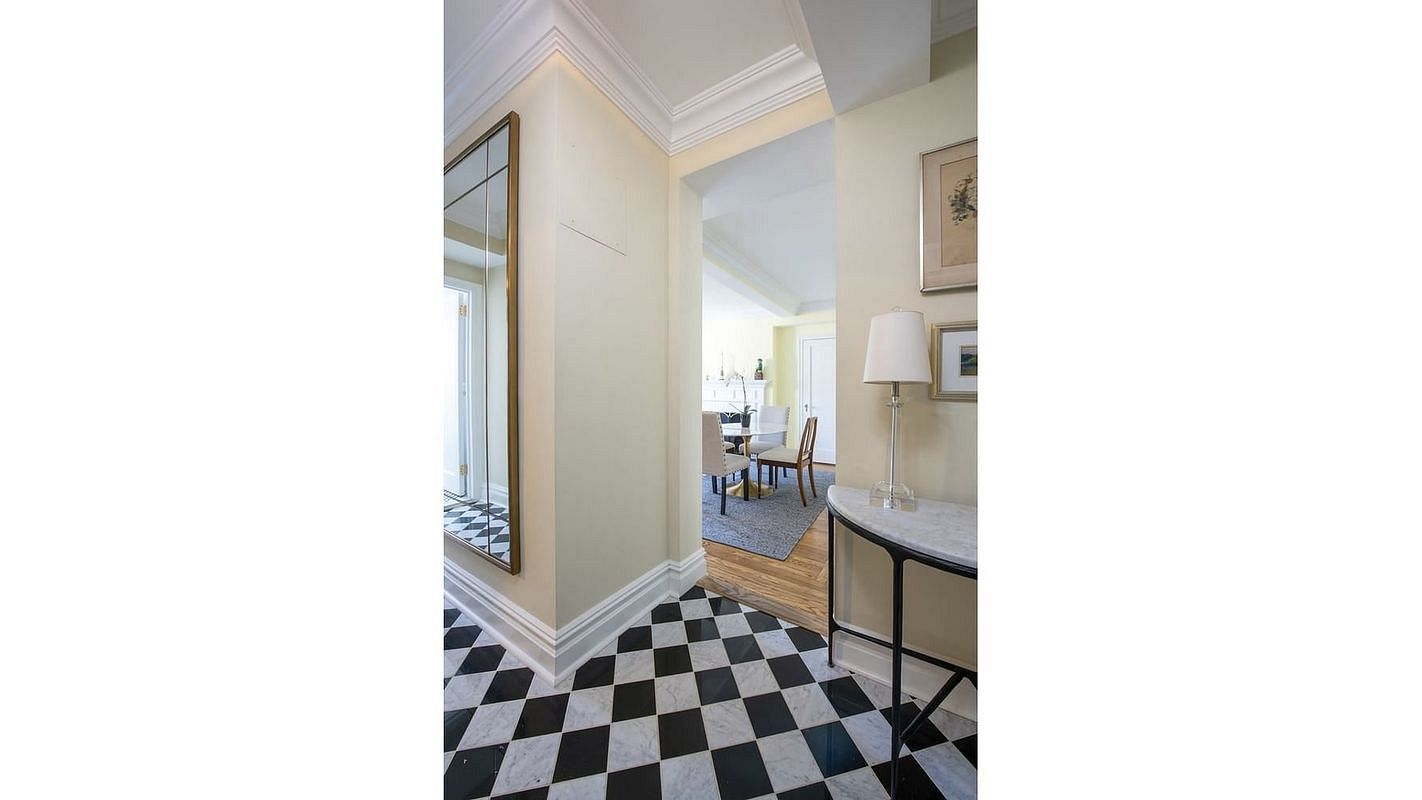Upon entry, visitors are greeted by a stylish foyer adorned with beautiful black and white marble tiles. The generously sized king bedroom includes two spacious closets, providing ample storage. The inviting living room is centered around a classic wood-burning fireplace, showcasing thoughtfully restored pre-war details.