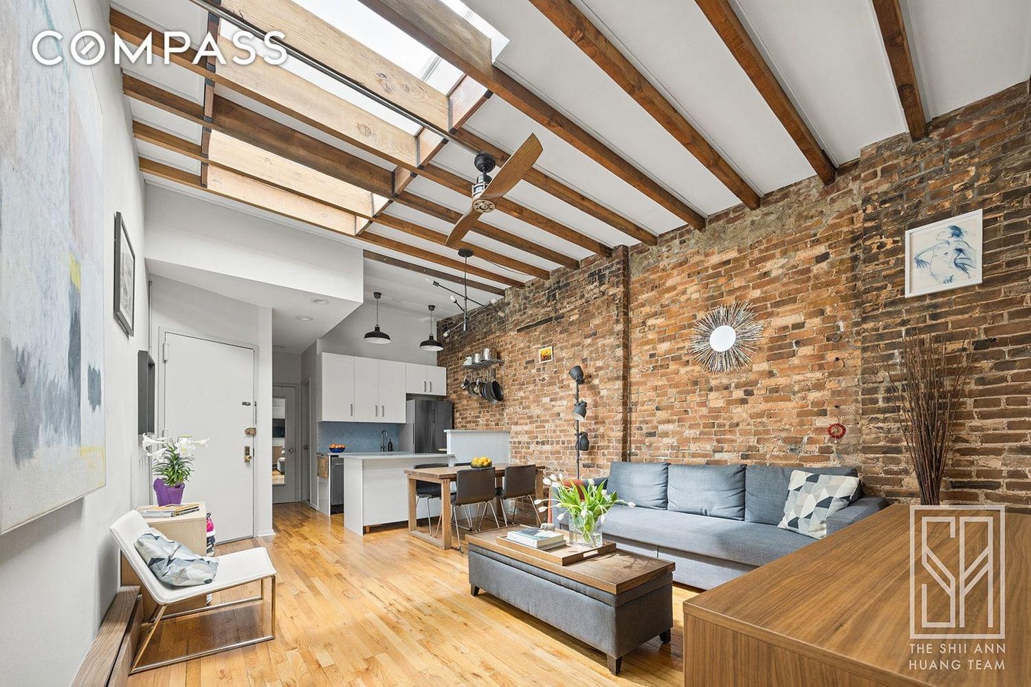 Step into the spacious living room featuring exposed brick, 10'+ ceilings, exposed ceiling beams and two enormous skylights, giving the space a unique character and an open, airy feel. The open layout offers plenty of space for a dining table, large couch, and television. The kitchen is both sleek and functional, featuring stainless steel appliances, counter space, and stylish cabinetry.