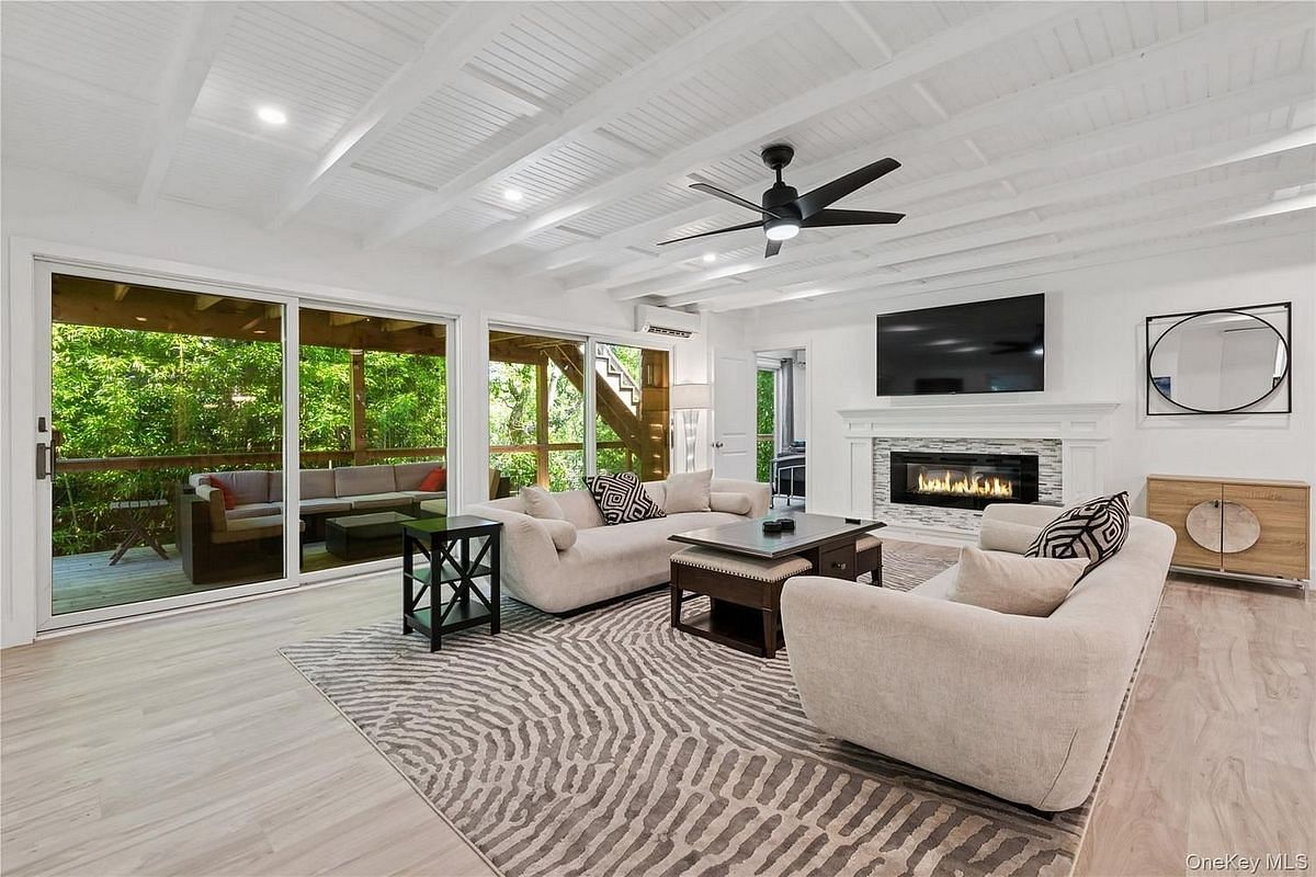 • Second Floor (Entrance to house on 2nd floor): The open-concept living area is anchored by an electric fireplace and a wall of sliding glass doors leading to a stunning new deck perfect for sun-soaked lounging or cocktail hours. The large dining room is wrapped in windows, bringing in tree-filtered light from every angle. The chef’s kitchen features quartz countertops, a large island, wet bar, stainless appliances, and custom soft-close cabinetry.