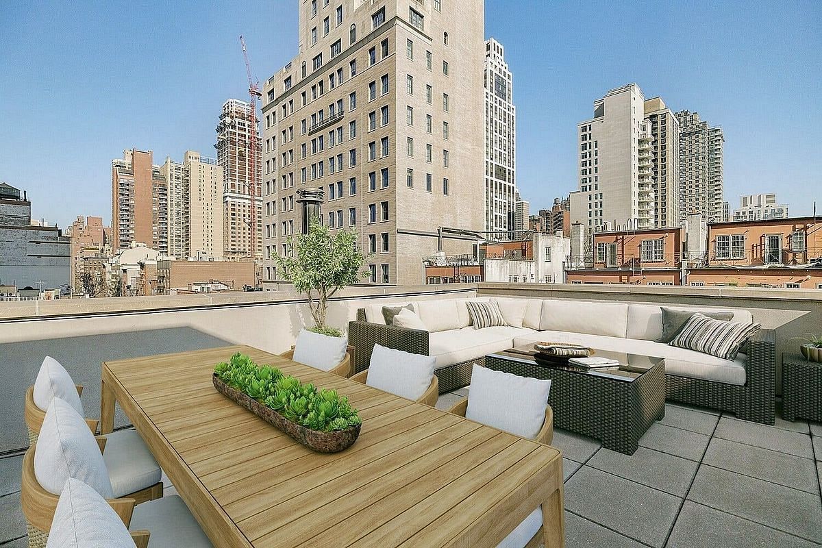 Crowning the home is an extraordinary 940-square-foot private rooftop retreat. A rare offering in Manhattan providing sweeping skyline views and endless possibilities for outdoor entertaining, dining, or quiet relaxation above the city.
