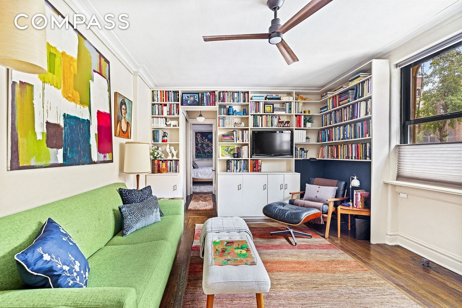 Located on the elevated first floor of The Chelsea Arms, a charming 1920's Art Deco Cooperative, this one bedroom maintains the classic prewar traditions, while incorporating modern and stylish renovations. The formal entryway timelessly welcomes you home with pendant lighting, custom closet and lovely French doors extending your welcome into the spacious living room. The two oversized windows greet you with abundant natural sunlight from the South facing views of the tree lined West 18th Street. The spacious living room has been outfitted with custom storage and shelving for home office use or extensive space to store all of your treasures. The kitchen has been completely renovated and redesigned with custom Italian designer Veneta Cucine cabinetry, Caesarstone countertops, stainless steel Miele stove top, oven/microwave, Liebherr refrigerator and spacious island for all of your culinary and entertaining desires. The renovated, windowed bathroom has been upgraded with stylish fixtures and finishes, recessed medicine cabinet and porcelain pedestal sink. Opening another lovely set of French doors, lead you to the spacious bedroom, highlighted by the elegant bronze tile ceiling. The bedroom and entryway closet, along with additional custom dual sided closet in the hallway, provide ample space for all your storage needs.