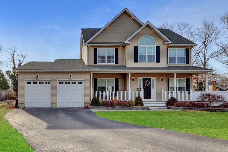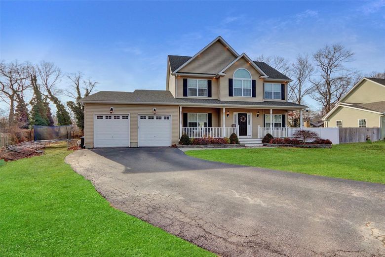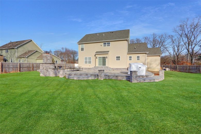 Welcome to 32 Grant St, a stunning home nestled on a quiet cul-de-sac in Port Jefferson Station. This spacious 4-bedroom, 2.5-bath Colonial design residence offers an open-concept design with soaring ceilings throughout, creating an airy and inviting atmosphere. The main living space seamlessly flows into a well-appointed kitchen and dining area, perfect for both everyday living and entertaining. The home features natural gas heating and two-zone central air conditioning, ensuring year-round comfort. Step outside to a beautifully designed backyard, complete with a patio, an outdoor fireplace, and ample space to create your dream outdoor kitchen. Additional highlights include an attached two-car garage and a full, unfinished basement offering endless possibilities for customization.