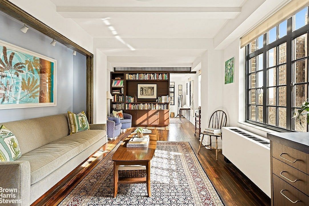 Residence #1001 is a charming corner one bedroom replete with natural light, views and special details. The apartment features high ceilings, original hardwood floors, casement windows with sunny eastern and northern exposures, thoughtful built-ins throughout and ample storage. The living room is large enough for a distinctive living/dining area, and features a sofa alcove with track lighting for art. The windowed kitchen features stainless steel appliances and multiple built-in storage cabinets. The living room and bedroom are separated by a bookshelf wall and custom Blenheim glass pocket door for privacy while still letting light permeate the space on both sides. The bedroom has multiple large built-in wooden closets and can fit a king-sized bed. There is a custom-built walk-in closet and separate coat closet in the entry. Apartment also has thru-wall AC.