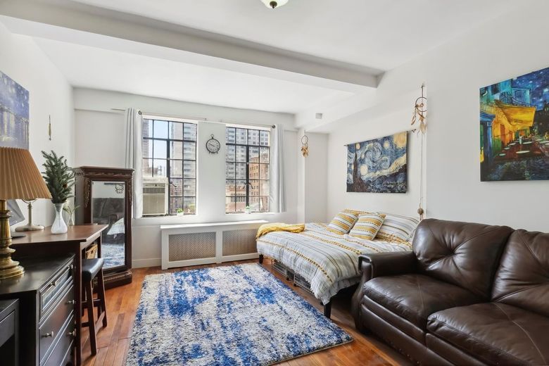Sunny studio at pet friendly Woodstock Tower with City views south. Only the listing agent can schedule a showing. Click bottom of page for listing agent to schedule appointment. Features include a renovated kitchen with a full oven, full size refrigerator and imported stone counter tops with breakfast bar. A large sleeping alcove can accommodate a king size wall bed. Rich wood floor throughout with removable AC. This studio has 3 closets. Bathroom has been upgraded with new fixtures. and a full-size soaking tub. Heat, hot water and electric are included in the very low maintenance.