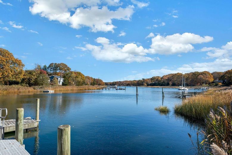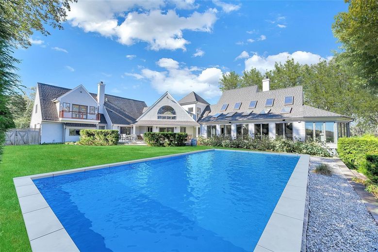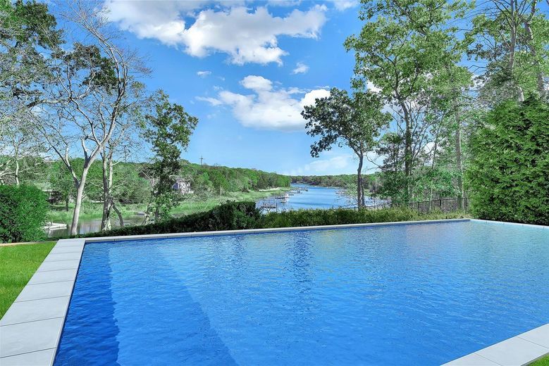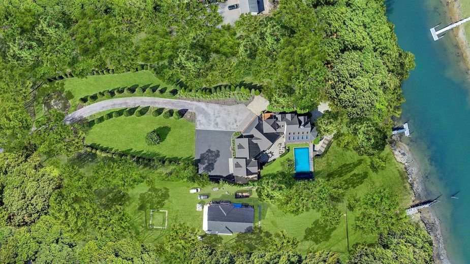 An extraordinary waterfront retreat set on 3.5 acres, featuring a saltwater pool and private dock. Nestled in an exclusive estate setting, this meticulously custom-built residence offers breathtaking water views and 290 feet of prime waterfront access, complete with a deepwater dock—ideal for boating enthusiasts. Crafted with precision and exceptional designer finishes, this home boasts a soft, modern interior flooded with natural light, large windows, and glass doors that frame stunning panoramic water vistas. The expansive great room, with its soaring ceilings and grand fireplace, is complemented by a custom gourmet kitchen equipped with top-of-the-line finishes. The open layout seamlessly connects the kitchen to the dining and living areas, creating the perfect space for both intimate meals and grand entertaining. Luxurious bathrooms with radiant heat further enhance the appeal. The lower level of the home is an entertainer’s dream, offering an expansive space designed for ultimate relaxation and fun. Featuring a custom-built bar, it’s the perfect spot for hosting friends and family, with sleek finishes and ample seating for everyone. A spacious game room provides plenty of room for various activities, making it ideal for movie nights, pool or billiards, and more. Large windows and a walk-out door allow natural light to flood the space, creating a bright and inviting atmosphere. Outside, enjoy the heated gunite pool by the water and the meticulously manicured grounds. This waterfront oasis embodies refined, unparalleled luxury, offering the ultimate in waterfront living and every amenity imaginable.