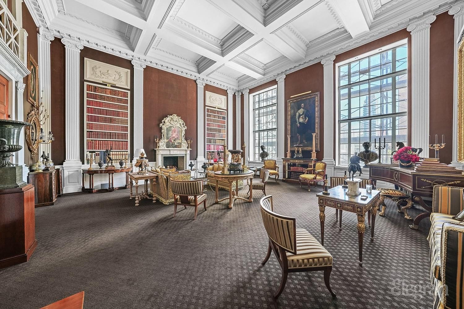 Step off the semi-private elevator and into a world of elegance, starting with a limestone gallery that welcomes you with open arms and a grand staircase leading to the 13th floor. The living room, a magnificent 27 x 27 square, boasts 18-foot ceilings and floods with natural light from two towering 12-foot casement windows. Crown molding and columns enhance the rooms symmetry, making this double-height space one of the most elegant youll find on the market today.