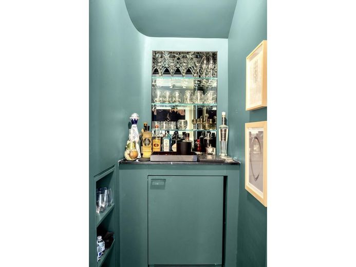 A discreet hallway leads to the private bedroom wing, boasting ample art walls, subtle lighting, and cleverly placed niches for displaying books and objet d'art. The glamorous "Nan Goldin Bathroom," adorned with Bisazza mosaic tile and high-gloss Hague blue, doubles as a guest bath and powder room.