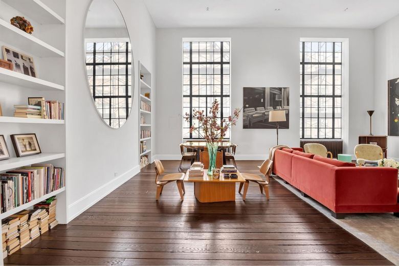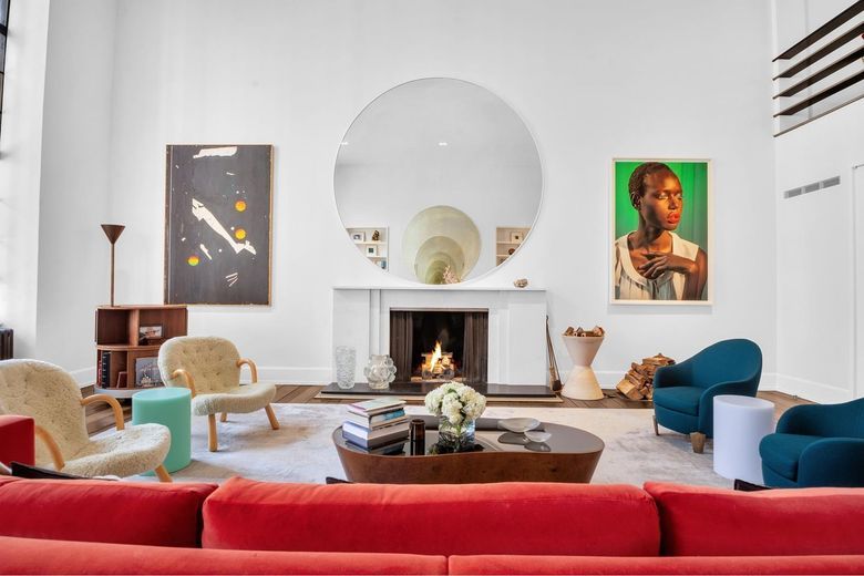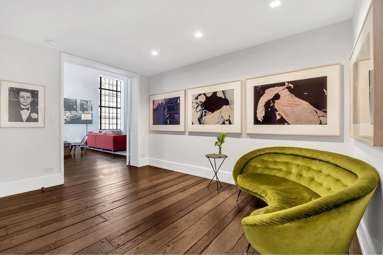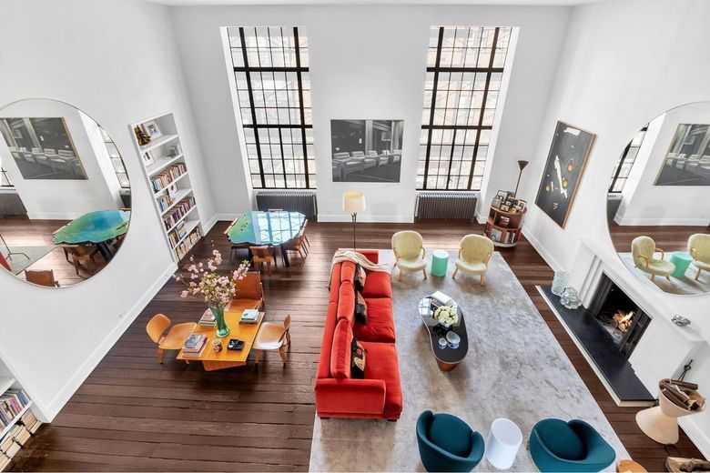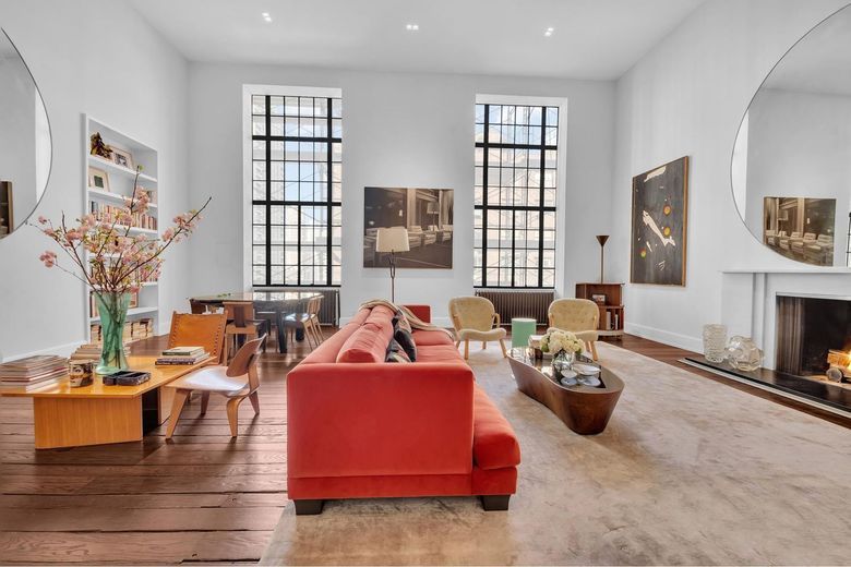 Upon arrival via your private elevator vestibule, you are greeted by a grand foyer boasting an elegantly curved staircase and a discreetly tucked-away built-in wet bar. The oversized great room captivates with its soaring 18-foot ceilings, original wood-burning fireplace with a stone mantle, and double-height restored wrought-iron casement windows that flood the space with natural light. Vintage restored wide plank hardwood floors add to the ambiance, creating an ideal backdrop for showcasing a world-class art collection. Reflecting infinite space and light, two circular infinity mirrors enhance the awe-inspiring atmosphere.