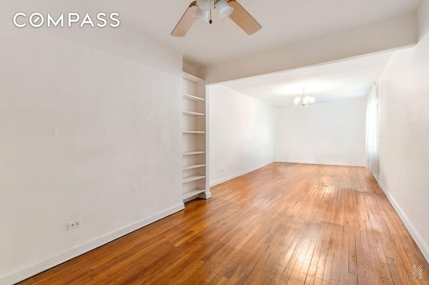This one-bedroom unit is in a quiet area of Jackson Heights. Upon entry, youll notice hardwood floors and natural sunlight from south-facing windows. To the left is a dining area that can easily seat a table for four and is completed by the stylish ceiling fan above. Beyond that is the generously sized living room that includes a built-in bookshelf. The space is perfect for various furniture layout options, such as a large sectional sofa or carving out space for a home office.