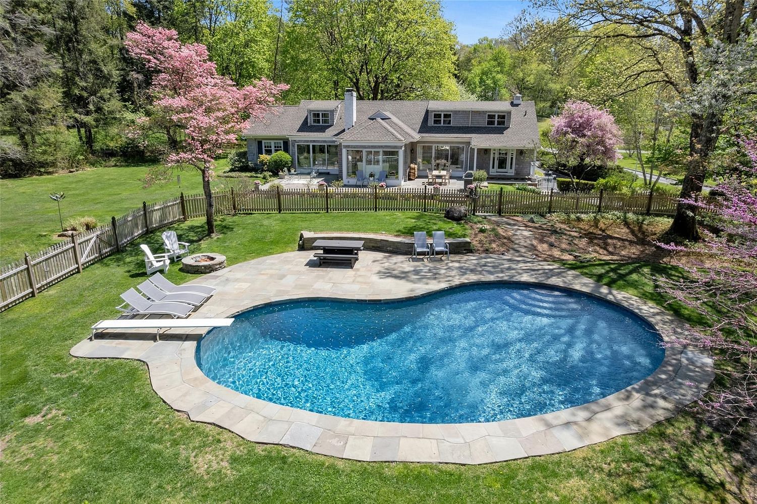 Life's a breeze in this elegant, Hamptons-esque Cape Cod set on 2.67 verdant acres with sparkling, heated, gunite, in-ground pool within prestigious Lawrence Farms South. A towering flagpole stands sentry in the impressive stone walled circular drive. The cedar shingle residence exudes charm from the moment you enter and has a great layout for entertaining. A welcoming entry immediately introduces a grand (piano-sized) and gracious living room, anchored by a marble-mantled, wood-burning fireplace and end-capped by a windowed alcove with sliding glass doors to the patio. Formal occasions are best served in the adjoining dining room, rich with hardwood moldings, millwork and flooring, and softly illuminated by variable recessed lighting and a wall of windows, including a sliding glass door to the patio. Cater any occasion, large or small in the amazing, sun-filled, designer kitchen with all the trimmings that any chef would relish; custom white, wood cabinetry; giant center island with prep sink, Ubatuba granite top and breakfast bar; cooking hearth with Wolf six-burner gas range topped with a stainless- steel hood; Thermador in-wall microwave and convection ovens; Sub-Zero side-by-side refrigerator/freezer; two KitchenAid dishwashers; Sub-Zero wine/beverage fridge; marble countertops; glass display cabinetry; built-in buffet; large corner dining banquette; and French door to patio for easy BBQ or alfresco dining. The family room, with its wall of built-in cabinets and display shelving, also enjoys a wall of windows, including a sliding glass door to the patio. All the main public rooms have large glass doors, seamlessly blending the interior and exterior living spaces. A tidy home office next to the kitchen suits any executive. Private quarters are composed of a large, main-level primary suite endowed with a king-sized bedroom, private, ensuite marble, limestone and onyx bath and walk-in dressing area; main-level, rear corner bedroom with walk-in closet; marble-tiled main-level full bath with shower over bathtub; upstairs bedroom suite with pool views and private ensuite bath with shower over bathtub; upstairs bedroom adorned with built-in dressers, and a divine window seat flanked by bookcases; across the hall stands a full bath with shower. The lower level is populated by a rec room with fireplace, powder room, laundry, utilities/mechanicals and garage access. And serviced by the winning trifecta of public water, sewer and natural gas. Outside is as lovely as the inside, with velvety green lawns front, side and rear, ringed with invisible fencing to keep furry family members safe. A tranquil pond attracts avian friends. Mature and established landscaping blooms with the varying seasons. The classic, kidney-shaped swimming pool with diving board provides endless hours of fun in the sun. And a BBQ and firepit add to the party. All nestled within a private enclave, in walking distance to school, shops, and town.