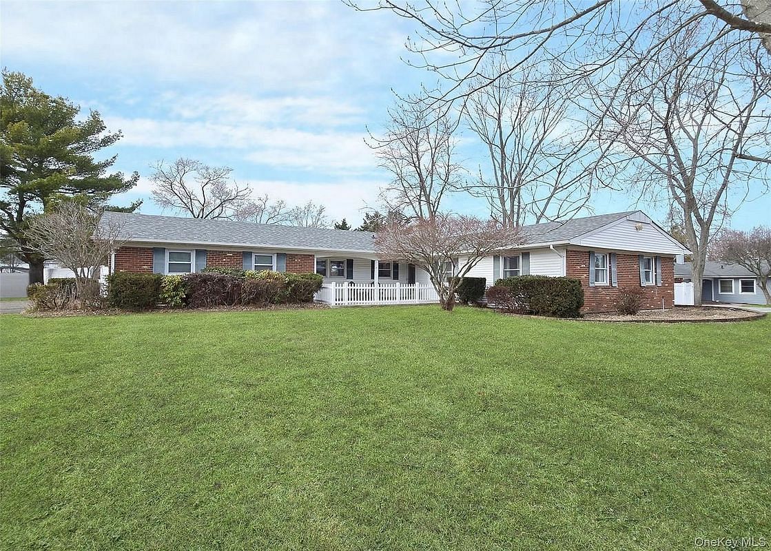 This Move in Ready 4-bedroom, 2-bath ranch is situated on over half an acre of land in the Three Village School District. The home boasts a full basement, a remodeled primary bath, and a 3-year young kitchen featuring cathedral ceilings and skylights that flood the space with natural light. Recessed lighting adds to the ambiance, while some newer carpeting. The roof, just 3 years young, is equipped with leaders and gutters. The home's CAC system has been updated with a new air conditioning unit on the main floor, serving 2 zones, as well as an updated boiler and new separate hot water heater. The windows have been updated, and PVC drain piping has been installed throughout the basement. Outdoor, you'll enjoy a cement patio and walkway, a 4-year young hot tub, and vinyl and wood fencing that defines the property. The grounds are also equipped with in-ground sprinklers, making lawn care a breeze. Your search is over!