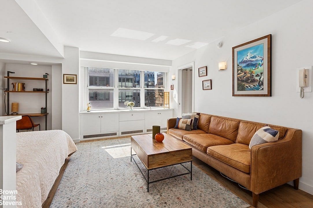Sun-filled corner studio with sweeping south and west city views-ideal for watching the sunset. Thoughtfully redesigned and fully renovated, this residence features a windowed open kitchen with dining bar, a spa-like windowed bathroom with marble finishes, soaking tub, and premium fixtures, plus abundant storage. The living area is enhanced by French Oak floors throughout, custom built-ins, a walk-in and a utility closet.