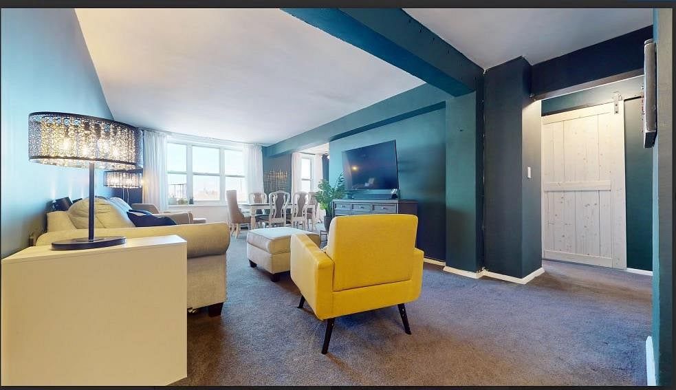 Directly Overlooking the Reservoir! Here is a completely unique co-op in Kingsbridge Heights, with tons of living space including two bedrooms, two full baths, a private terrace, and stunning views of the Jerome Park Reservoir. With sunny exposures on two sides, this corner residence offers scads of upgrades and one of the building’s largest floorplans. A roomy front gallery with extra closet space flows right into the huge L-shaped living and dining area. A wall of windows offers direct views of the reservoir and the city skyline beyond. The apartment with its custom wall colors has high-quality carpet. Overhead beams add to the dramatic ambience. The dual entry gallery kitchen with hardwood floors has been beautifully remodeled with stone counters, stainless steel appliances, and white wooden cabinetry with frosted glass panels. Take your meals to the dining room, or onto the covered outdoor terrace with its magnificent vistas. A sliding barn door opens to reveal the primary bedroom suite with windows on two sides and views of the water. Two more large custom sliding doors open to a walk-in closet with custom organizers, and an ensuite bath with fleur de lis floor tiles, designer wall sconces, and large walk-in shower. The second bedroom with its tall window and generous closet space can also function nicely as a music room or den. A full hallway bath features wall-to-wall white tile, a shower/tub combo, a towel cabinet, and a cute vessel sink. This pet-friendly midcentury building has an on-site super, laundry, elevator, and parking garage (waitlist). You’ll be around the corner from Fort Independence Grocery and close to Starbucks, as well as restaurants like The Bronx Public, Floridita, and Doughboys Pizza. The massive Van Cortlandt Park with its lake, playing fields, and public golf course is less than a mile away.