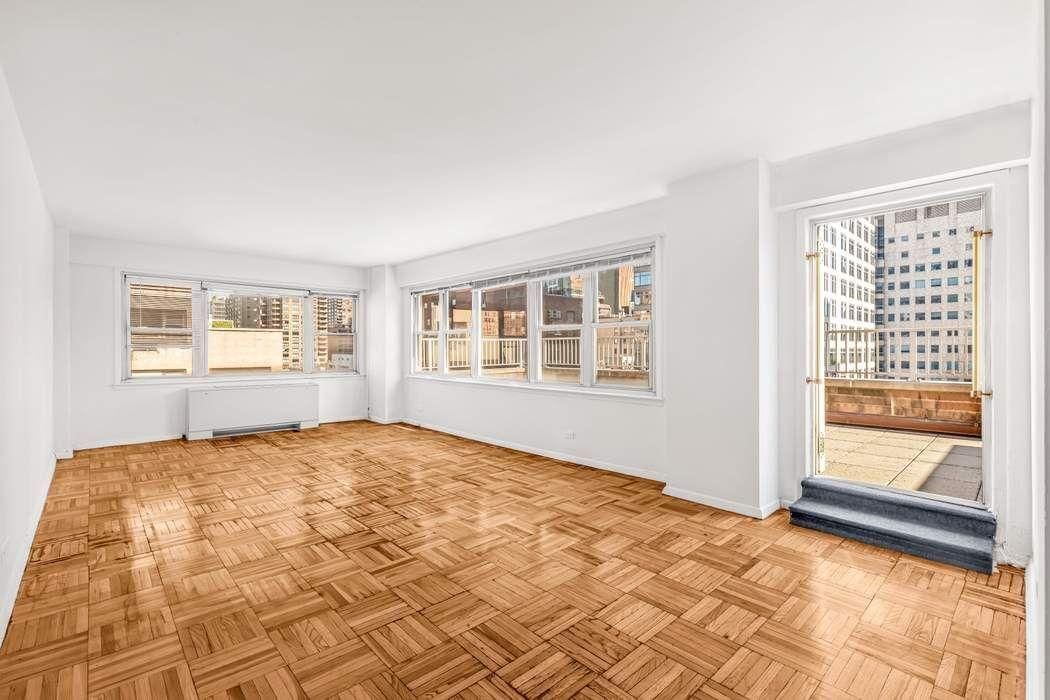 This lovely high floor unit, boasts a magnificent private terrace with amazing skyline views and tons of light. Upon entrance you will be welcomed by a large foyer featuring a generous closet. The bright and sunny Northeast- facing living room offers ample space for dining & entertaining. The bright kitchen contains a large window for cooking convenience. The massive private terrace offers unlimited entertainment opportunities year round, it faces directly East with North, South & Eastern views of the city skyline. The spacious north facing bedroom is ideal for a king-size bed, a home office, and boasts large closet space for all your needs. A deep linen closet provides extra storage, and hardwood floors flow throughout the apartment. Two controllable AC units ensure comfort. Bring your architect and create your dream home!