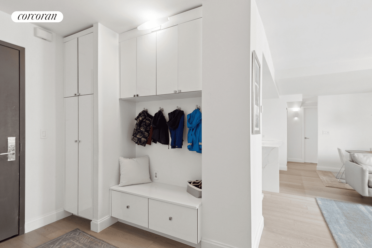Upon entering this turnkey, Penthouse, two bedroom home you are greeted with a foyer that is typically only seen in the suburbs. Plenty of space and storage for shoes, jackets and rain gear without worrying you'd be muddying up the rest of this mint home. The living room is perfectly proportioned to have both a formal dining area as well as entertainment space all while looking north at your private terrace, the city skyline, Hudson River and Empire State Building. A fully renovated, open chef's kitchen with gorgeous white cabinetry, quartz countertop, breakfast bar and Thermador stainless steel appliances is a wonderful place to cook and entertain. The primary bedroom has double exposures showcasing both the Hudson River and the Empire State building and is outfitted with two double door custom closets and an en suite marble bathroom. The oversized second bedroom has two large windows, views of the Hudson River, two double door custom closets and direct access to the 100 sq ft terrace. Enjoy reading, gazing at the city skyline or watching the sunset over the Hudson River with friends from your sizeable open terrace. Other features of this special home include a second full marble bathroom, white oak floors throughout, upgraded soundproof windows, Nest smart thermostats and top of the line Miele washer/dryer.