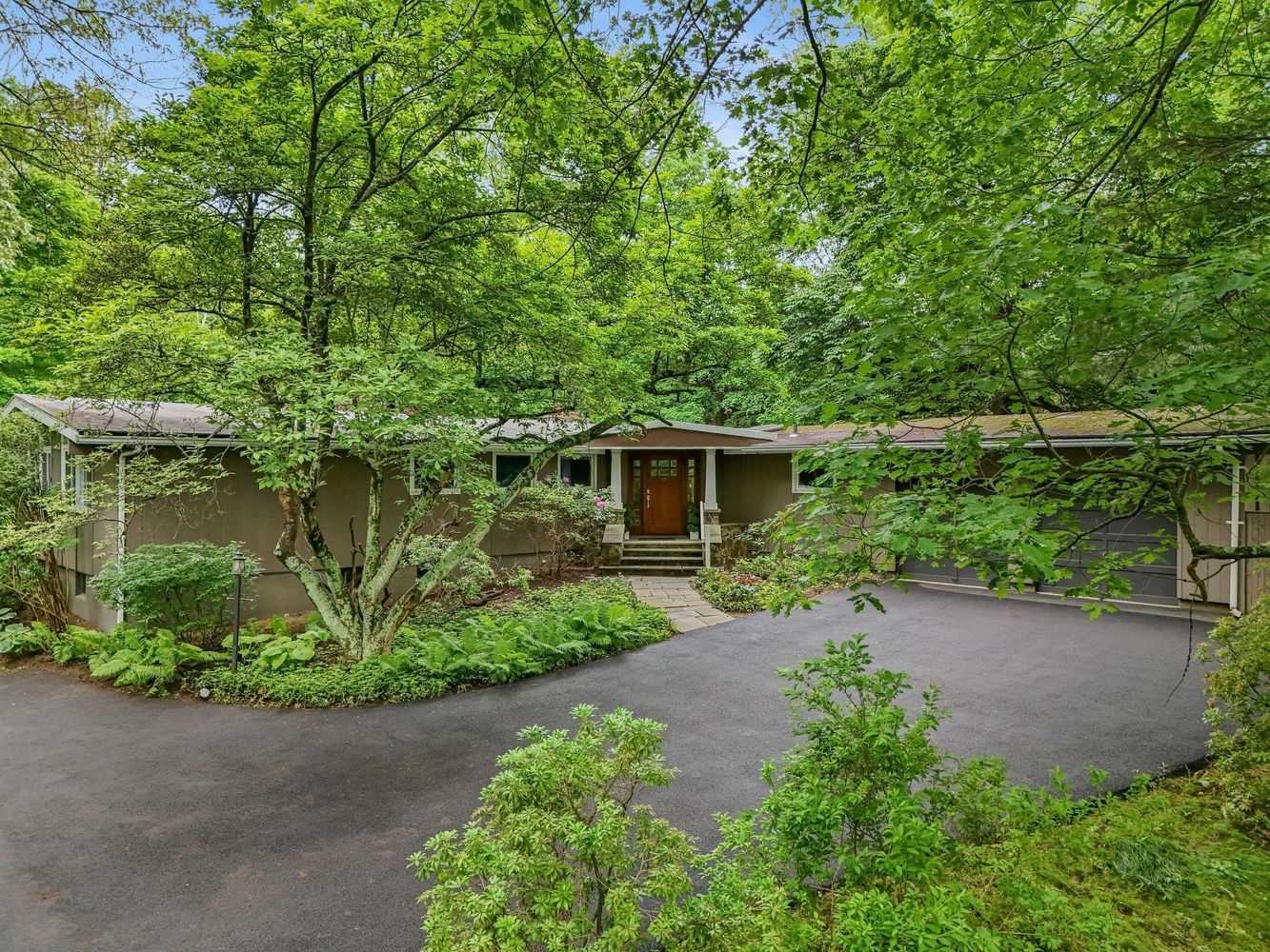 Stylish 1950s Mid-Century Modern Inspired Ranch with Contemporary Flair Near Katonah Village. The property is surrounded by beautiful and private BRLA trails.