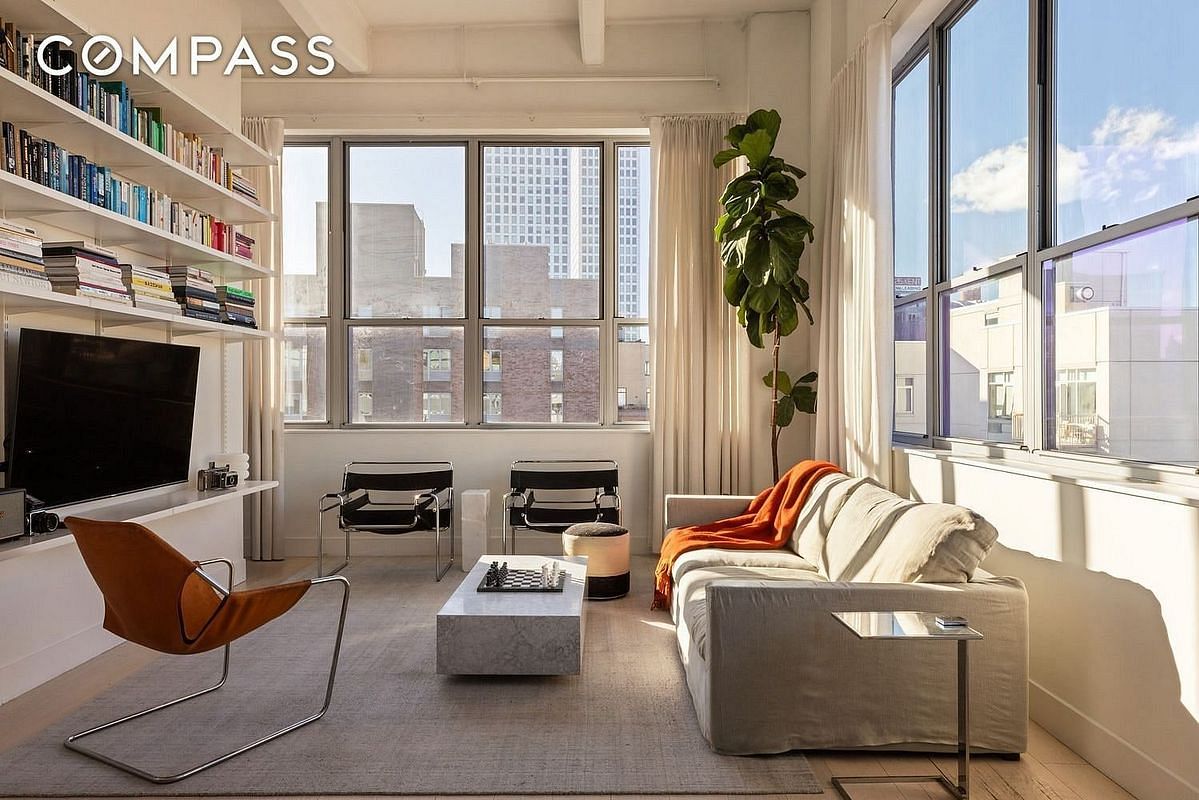 The home embraces true loft living, with dramatic ceiling heights exceeding 12 feet, exposed structural elements, and oversized industrial windows that bring both scale and character. The layout offers a seamless flow between living, dining, and entertaining spaces, all enhanced by the volume and natural light.