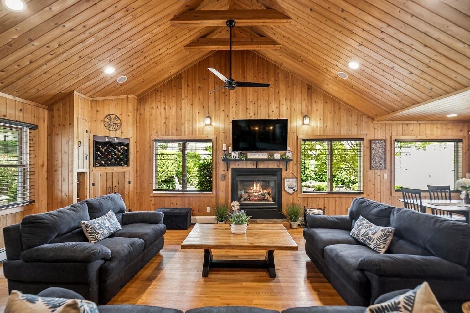 Enter inside to a stunning Grand Great Room, featuring soaring vaulted ceilings, detailed Cedar woodwork, and a beautiful fireplace that serves as the room’s centerpiece. The open floor plan is perfect for both everyday living and entertaining guests.