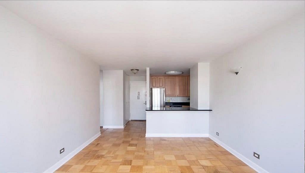 The pass-through kitchen is thoughtfully designed for both functionality and flow. It features a dishwasher, ample cabinetry, and a marble breakfast bar that opens directly into the living spaceperfect for casual dining or hosting. Storage throughout the apartment is abundant, allowing for clean, uncluttered living.