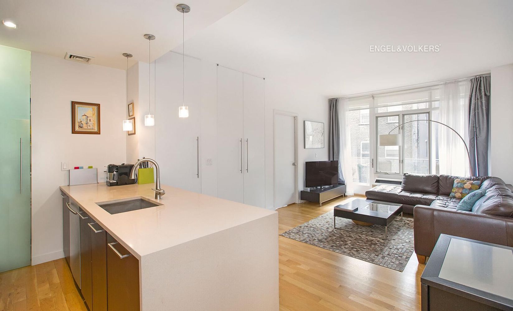 Spacious Living in a 2 bed/2 bath Condo Home with Terrace. High Ceiling/Southern Exposure. Open kitchen has quartz counters, Jean-Air stainless steel appliances and elegant wood cabinets. hardwood flooring throughout the home. The primary bedroom features an en suite bath with a deep soaking tub. In unit Washer/Dryer