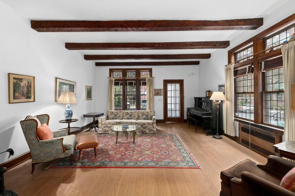 Neo-Tudor semi-attached house with original basement mother-in-law suite with 2 entrances to the lower level is a value added feature of this house. The suite features the original wood paneled living room with stucco and brick fire place, leaded glass windows in the below grade living room, windowed bedroom, old kitchen and newly installed bath. The first floor main entrance brings you to a small vestibule and a sophisticated high ceilinged living room with beams, fireplace, original wrought iron light sconces, and leaded glass windows with color highlights. Pass through the Tudor archway to the full-sized dining room with leaded glass windows and stunning wood paneling surrounding the entire room. The light filled large kitchen with eat-in dining area has windows facing east and north and opens onto a terrace. What a pleasure to dine al fresco on the terrace. Stairs with unique wrought iron railings lead to the 3 spacious and light filled upper bedrooms with vistas north, west, and east. They share 2 baths, one in the hallway with tub and one en-suite with shower. Hardwood floors are throughout the main living areas. A charming gardened area is in the front of the house while the back of the house has a patio edged with plants. Both roofs on the house and the one car garage are new and air conditioning lines were added a few years ago. There is room in the driveway for 2 additional cars. Located in Kingsbridge Heights on historic Giles Place one block from the Jerome Reservoir near the top of the hill for excellent sun. If you are interested in restoring and creating a new home with Neo-Tudor details this home is for you. Near the 1 train at 238th St., the 4 and D trains, and local buses on Sedgewick Ave. The Jerome Reservoir playground is a block away. Zoned R6A for up to 6 and 7 story apartment buildings. Public record sq. ft. is 1,696 and does not include the mother-in-law suite. Lot: 2,343 sq. ft. The one car garage is 200 sq. ft. Sold in As Is condition.