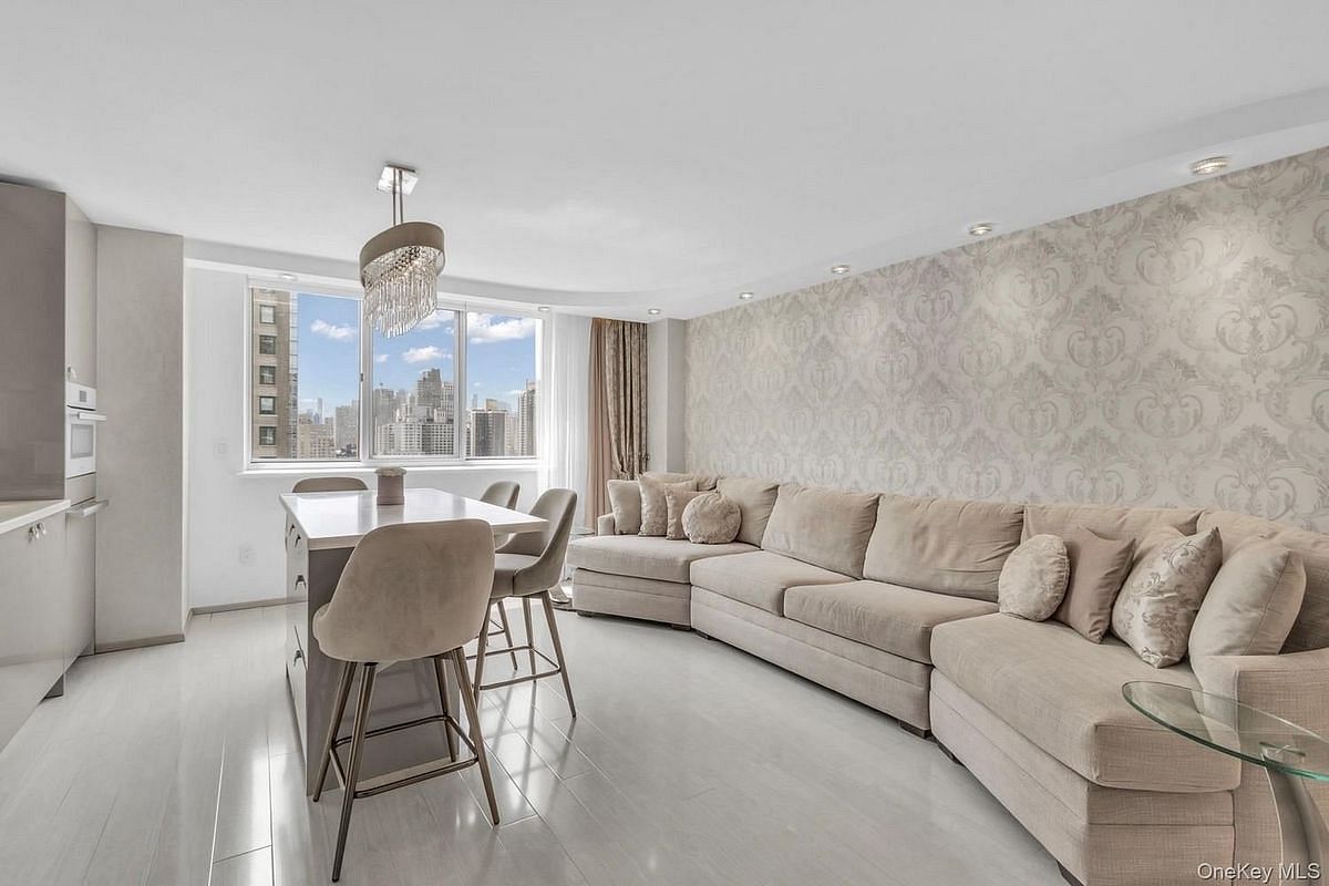 Beyond the panoramic Midtown skyline views to the south, the main living area features elegant custom touches, including an accent wall with venetian plaster and designer wallpaper; illumination from a magnificent Italian chandelier and recessed perimeter lighting accented with Swarovski® crystals; and custom shelving that serves to both display and partition the space. The island kitchen, with an ideal layout for entertaining, features custom cabinetry and hardware; premium appliances including a Miele® refrigerator, cooktop, hood, and speed oven; Bosch® dishwasher; crisp backsplash; and antimicrobial Corian® Solid Surface under-cabinet and dine-on countertops (also used for matching windowsills).