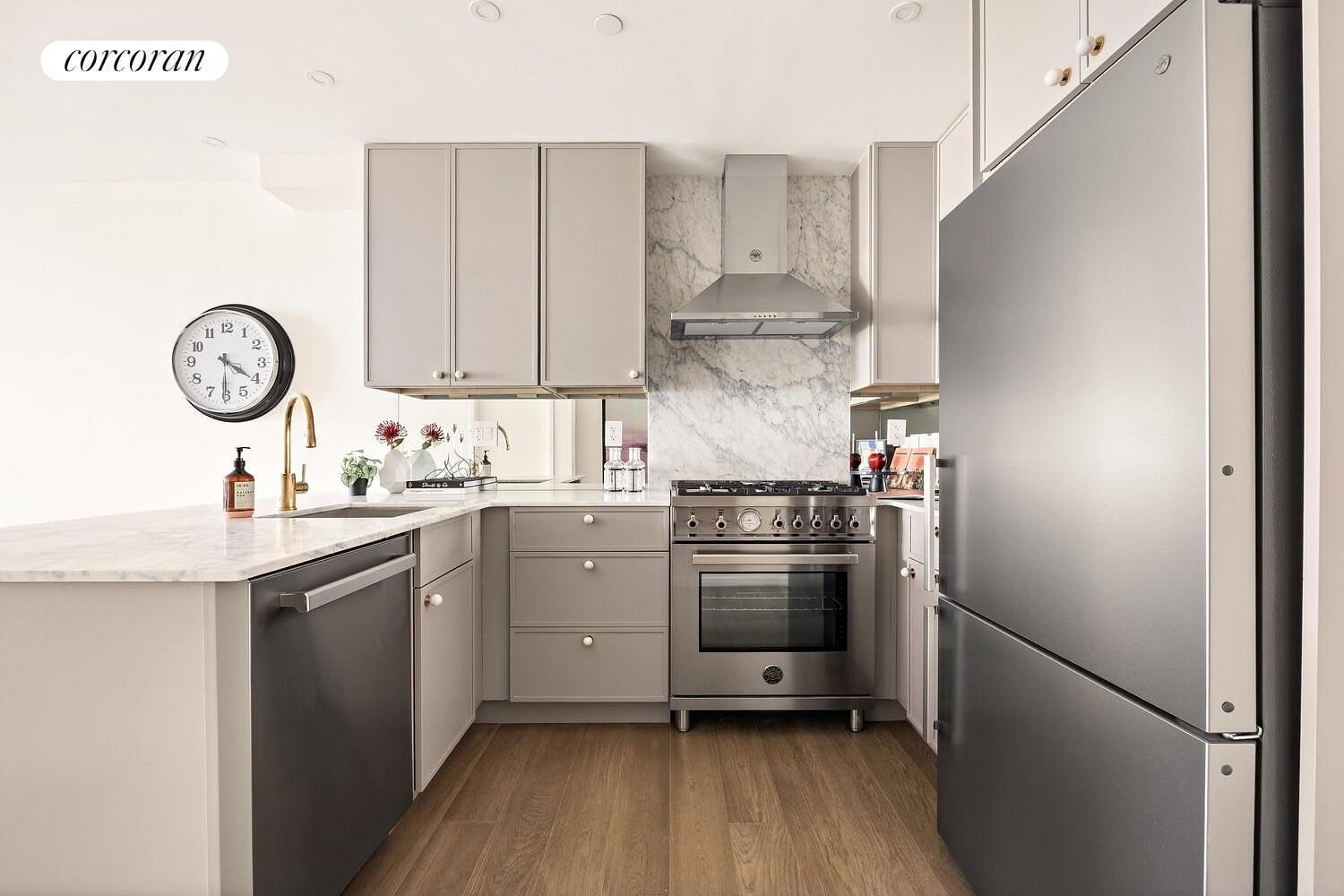 Regardless of which floor best suits your needs, all of the spaces have been outfitted with a suite of luxury finishes and amenities that include central AC, chef's kitchens, oversized bathrooms with natural stone, great closets, LG washers and dryers, hardwood floors, and all new double-pane windows. The first and second floor units are oriented to the private gardens with spacious kitchens and living spaces that flow perfectly to the private yards. The upper two units have been flipped, and enjoy street-facing park and treetop views facing south from the extra-wide living and dining spaces. The inspired kitchens include custom warm gray cabinetry; brass hardware; honed Carrara marble countertops, backsplash and island; and unique mirrored backsplashes that bring in dappled light all day long. Enjoy an oversized stainless steel Bertazzoni fridge, range and dishwasher, beautifully complementing the stylish aesthetic seen throughout.