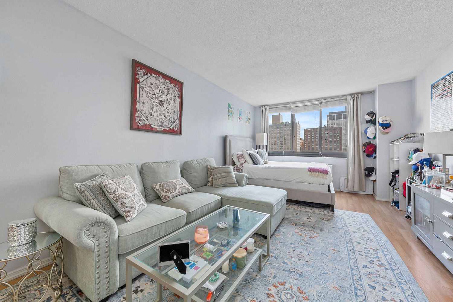 Back toward the entry, your kitchen opens directly into the living and dining area and features full-sized appliances, ample cabinet space, and modern finishes. The living area is bathed in natural light with views of the Manhattan skyline. With more than enough room to define separate zones for sleeping, dining, working, or relaxing, the layout offers flexibility and comfort in one of the citys most desirable neighborhoods. A tucked-away sleeping nook in the corner of the room creates a natural divide that makes the space feel even more like home.