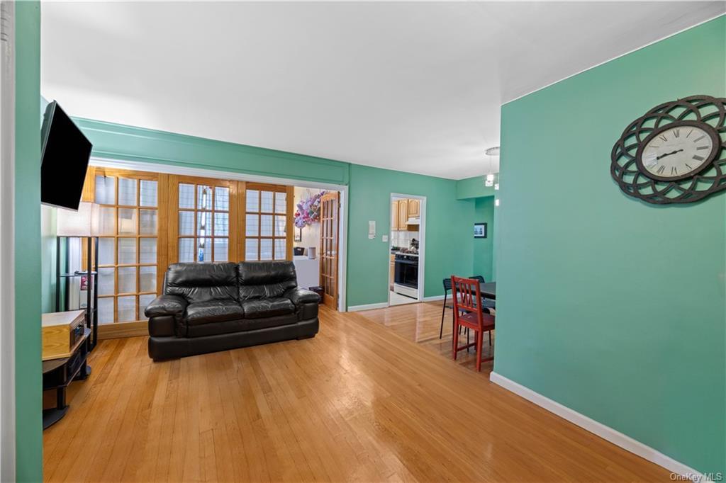 Spacious Junior 4 apartment coop has been converted to 2BR. The unit features hardwood flooring throughout and great light, lot of closets. Airy eat-in windowed kitchen and a freshly renovated bathroom . Wide open views from every window let in plenty of light. Live-in superintendent, laundry room on-site, walkout basement, and a wait-listed garage. Great street parking and close to all shops, restaurants and coffee shops on Riverdale Ave and Johnson Ave . The building is a 8 minute walk to the number 1 train. All other buses are 1 block away. Sorry No Dogs. Maintenance $1082.01. Western exposure. Square footage is approximate.