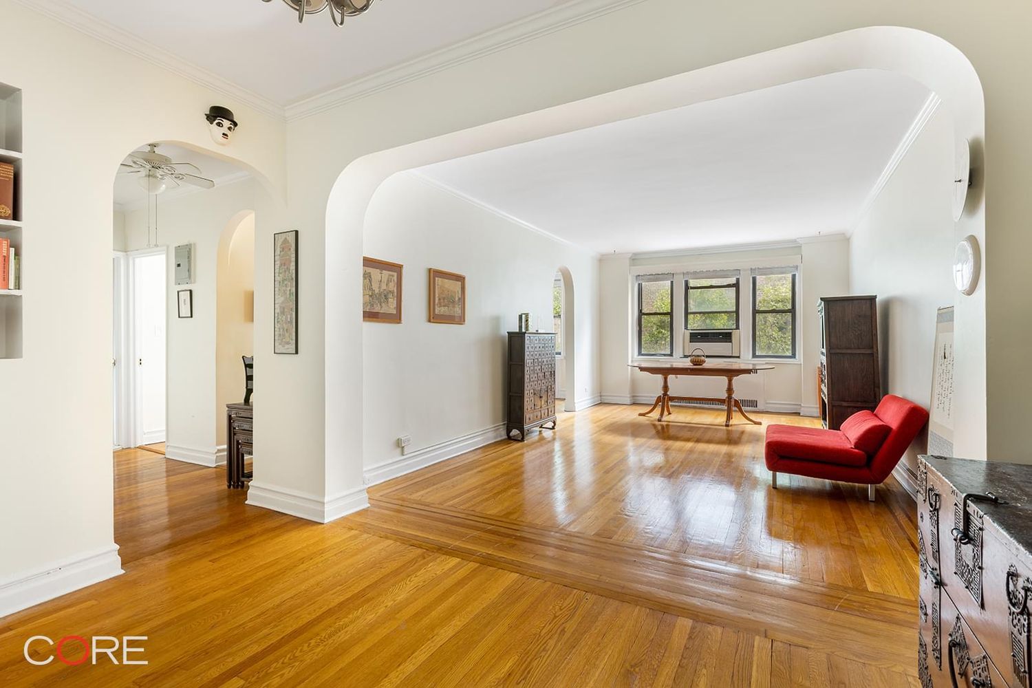With its garden home charm, this lovingly kept and updated corner home is nestled amidst one of the most celebrated and picturesque Jackson Heights gardens. Surrounded by beautiful greenery this bright and spacious home has a welcoming spacious foyer, a massive living room, a windowed eat-in kitchen, an extra-large bath, an extra spacious corner bedroom, ample closets, and an abundance of pre-war charming architectural features.