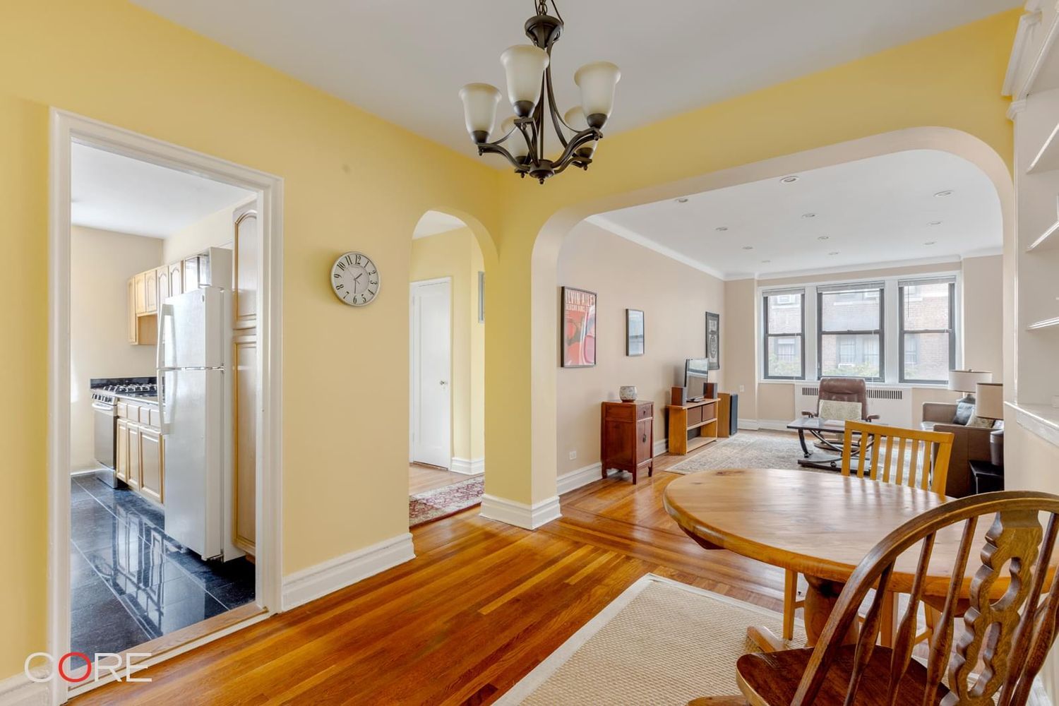 This well-appointed corner home, with exposures to the west and south, offers an abundance of natural light and a serene view of the building's private garden. The spacious home features refinished hardwood floors, recessed lighting, a renovated windowed bath, and a large kitchen with a granite countertop. Ample closet space enhances the home's functionality, while the tranquil garden view provides a peaceful escape.
