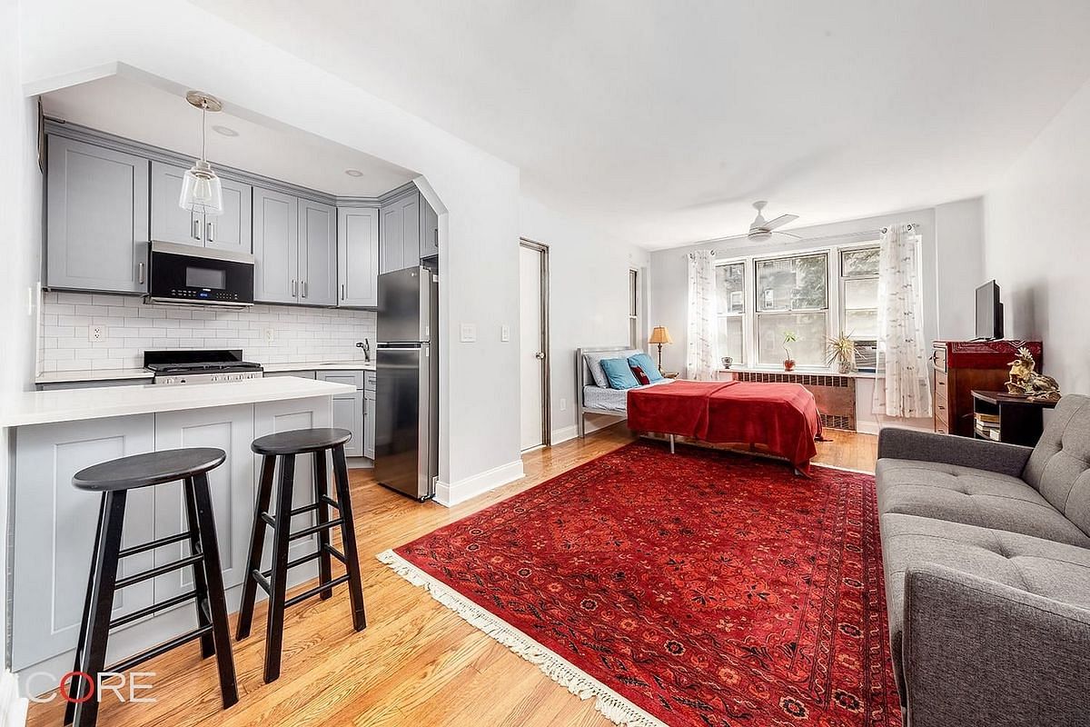 The kitchen offers stone counters, a custom ceramic tile backsplash, quality cabinets, and is equipped with a full line of stainless steel appliances. The generous living area enjoys the view of the private garden and amazing natural light. It is cleverly reconfigured to allow for a double exposure and easy access to the fully renovated bath.