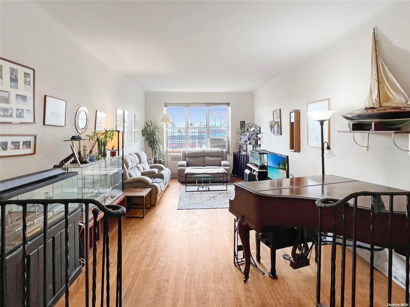 Welcome to The Berkeley, a distinguished pre-war co-op in Jackson Heights' historic district. This top-floor 2-bedroom, 2-bath apartment boasts stunning city views and classic elegance. Enter through a spacious foyer into a sunlit living room with high ceilings, hardwood floors, and large windows. The dining area showcases beautiful architectural details. The updated kitchen features ample cabinet space, and a cozy breakfast nook. Both bedrooms are generously sized with plenty of closet space, including a walk-in closet among the nine total closets in the unit. The master bedroom includes an en-suite bath, while the second full bath features classic subway tile and a deep soaking tub. Residents enjoy a private garden, on-site laundry facilities, and dedicated storage spaces. Experience the perfect blend of historic charm and modern amenities at The Berkeley.