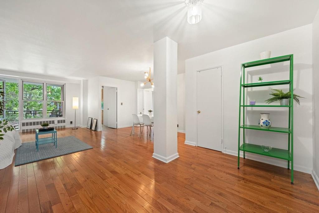 Nestled under a canopy of lush trees while at the same time very sunny, this apartment provides a lovely and tranquil environment. The large living room has flexibility and space for dining, living and working, entertaining and relaxing. There are two bedrooms that fit king size beds, and the ample closet space is a great practical bonus. The separate kitchen has a huge window. There are real hardwood floors throughout, and a fresh coat of paint on the walls. With some uncomplicated updating to the kitchen and bathroom, this well-designed and comfortable living arrangement would be spectacular.