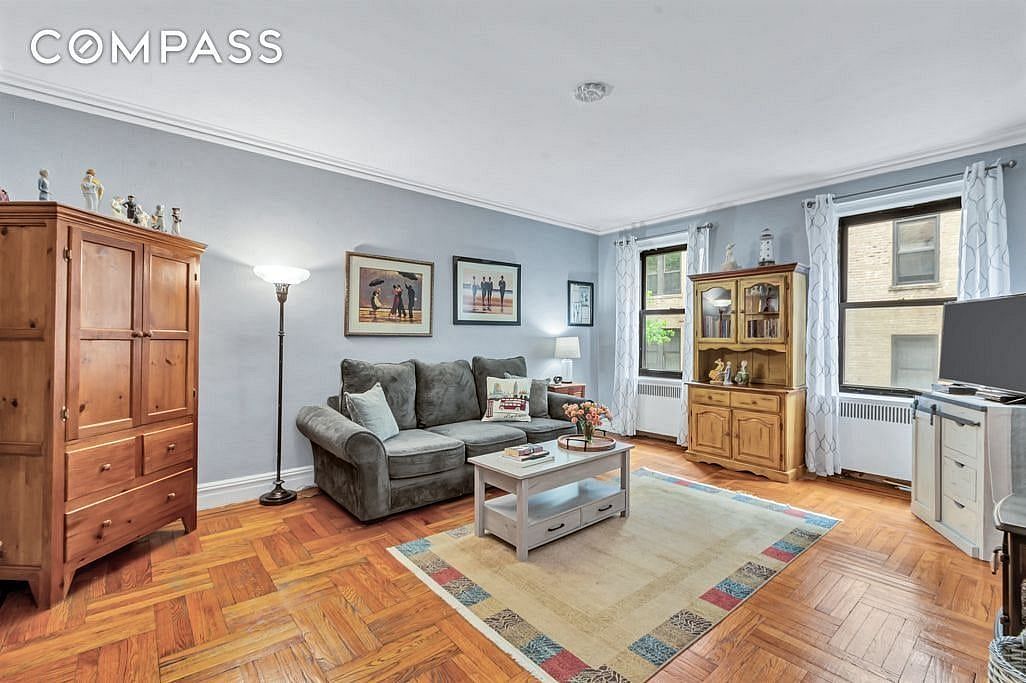 Marvelous corner Art Deco 1-bedroom, 1-bath residence brimming with all the prewar charm you could ask for. This inviting home features beautiful basketweave hardwood flooring with mahogany inlay throughout, soaring 9 ceilings, and generous closet space.