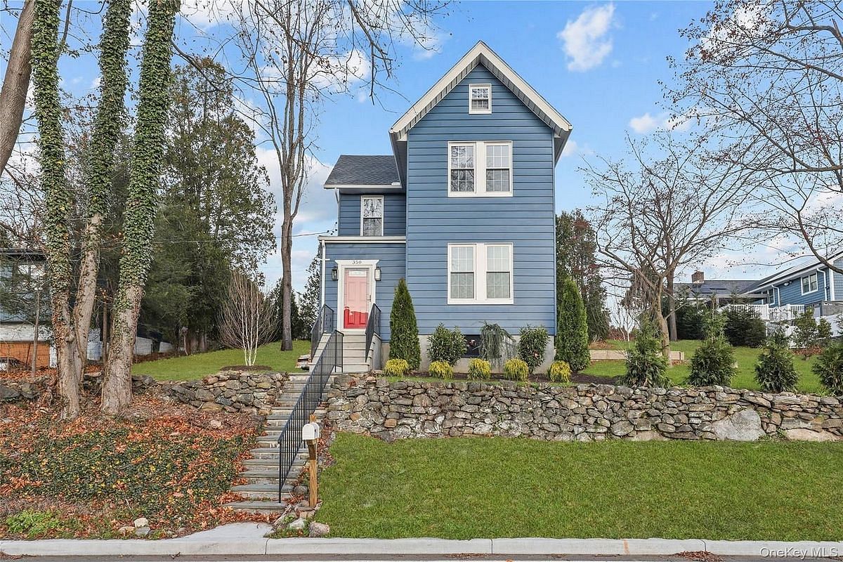 Step into a beautifully renovated home where modern sophistication and classic charm create an unforgettable first impression, enhanced by its striking blue exterior paired with timeless black shutters (install soon). A large foyer welcomes you in, setting the tone for the thoughtfully updated interior. The dining room is perfectly situated adjacent to the living room, creating an inviting, open flow ideal for everyday living and entertaining. The elegantly updated, generously sized kitchen features modern finishes, a gas stove, and French doors that open to the patio and beautifully landscaped yard. The second floor offers three bedrooms with a stylish updated full bathroom, enhanced by two additional double closets in the hallway and beautiful knotty pine flooring that adds warm rustic charm throughout. With the interior perfectly appointed, step outside to the elegant bluestone patio with lush landscaping—an ideal backdrop for entertaining or unwinding. The exterior also features a separate one-car garage with an adjacent barn, a long driveway for ample parking, and the unique benefit of frontage on two roads, providing additional convenience and versatility. A rare opportunity to own a truly turnkey property just moments from the train—an easy walk for commuters, offering unmatched convenience. Situated in sought-after Hawthorne, residents enjoy a warm community feel, excellent Mount Pleasant schools, easy Metro-North access, and close proximity to parks, dining, and major commuter routes—making it one of Westchester’s most desirable places to call home.