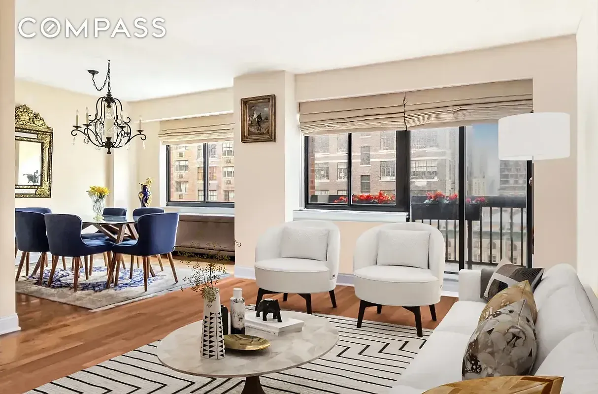Set on the 12th floor, this elegant residence opens through a gracious center-hall gallery and foyer outfitted with two closets. The home unfolds into a sun-flooded living and dining room, framed by a wall of windows, a Juliet balcony, and wide open city views. This expansive great room offers an ideal backdrop for both sophisticated entertaining and relaxed everyday living, while the dedicated dining area can convert seamlessly into a third bedroom or office.